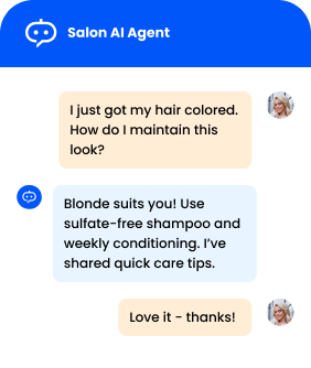 Train your AI agent by utilizing client preference data, their service history, their visits, and type of hair, etc. This will allow you to provide context based personalized interactions.